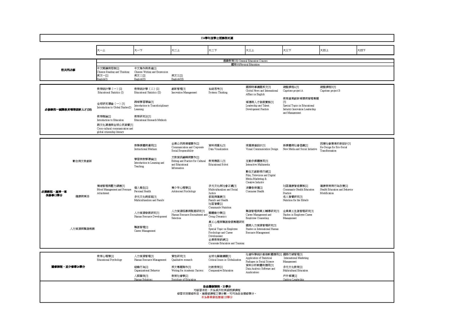 - 公民教育與活動領導學系:戶外活動 一(大一)、戶外體驗教育(大一)、民主政治(大一)、多元文化通論(大二)