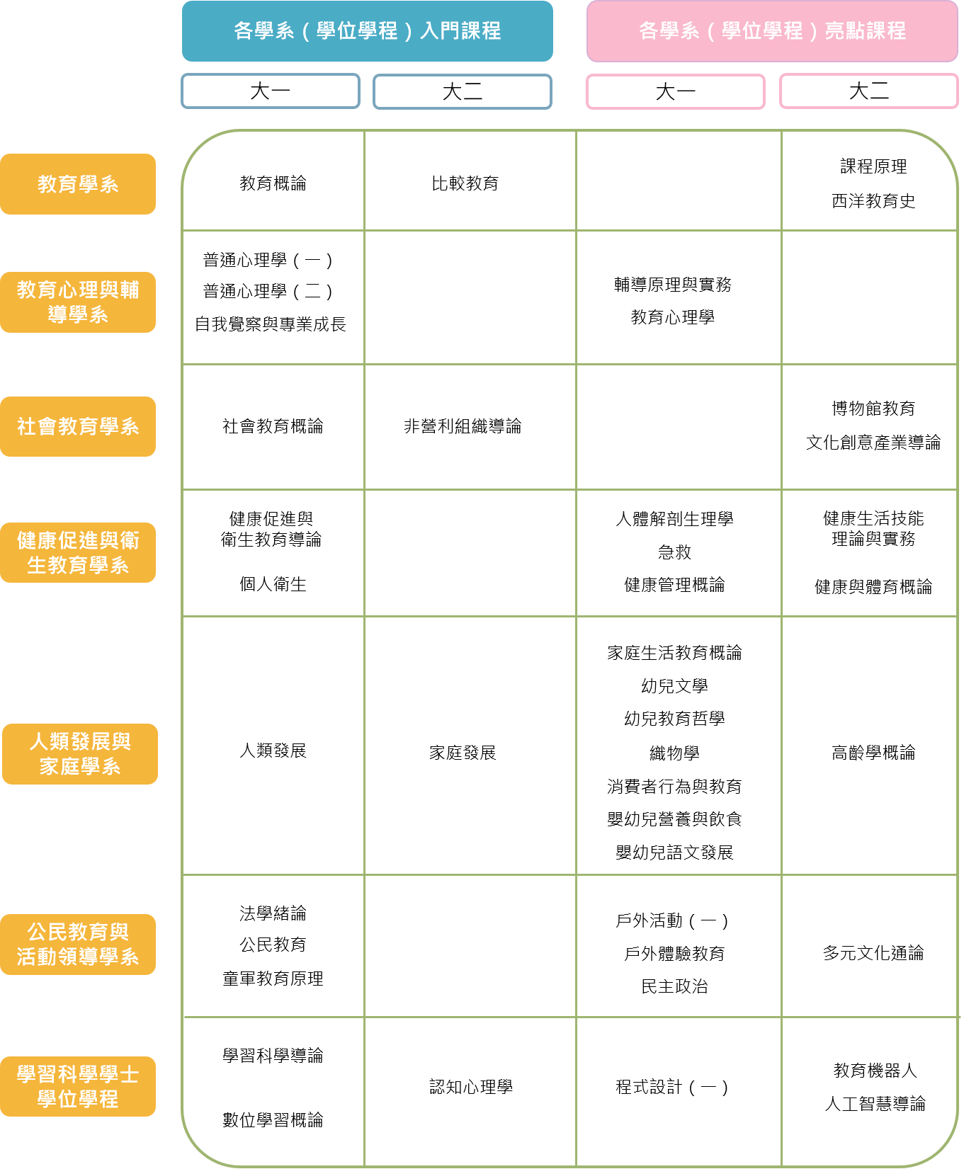 - 教育心理與輔導學系:輔導原理與實務(大一)、教育心理學(大一)